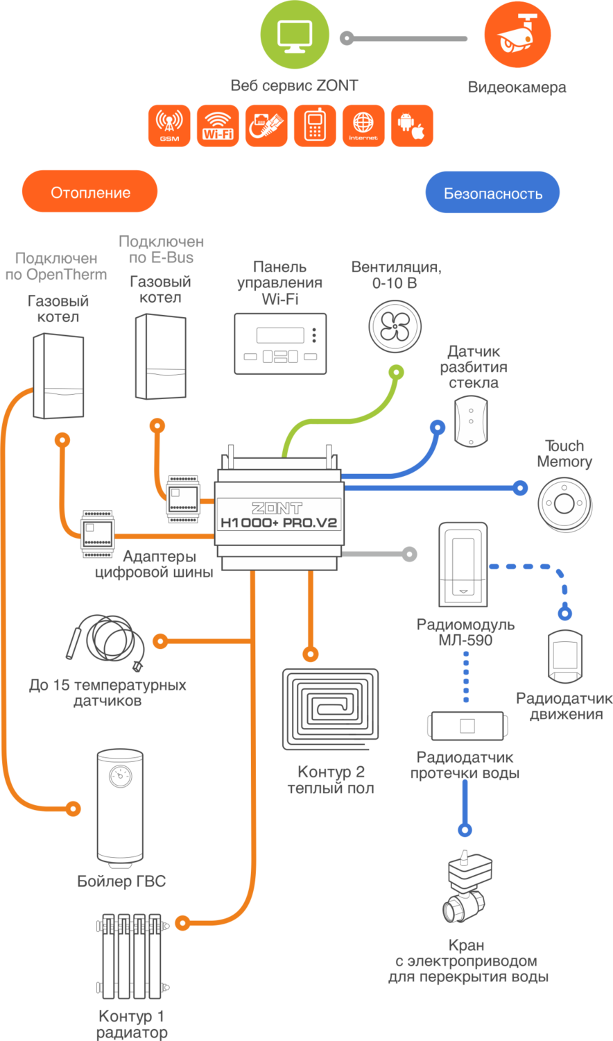 ZONT H1000+ PRO.V2 управляется автоматически по запрограммированному алгоритму или вручную – через личный кабинет веб-сервиса, мобильное приложение, дополнительную панель управления доступно управление в отдельных зонах через комнатные термостаты. Контроль параметров системы отопления и состояния подключенного оборудования доступен из личного кабинета веб-сервиса и мобильного приложения.