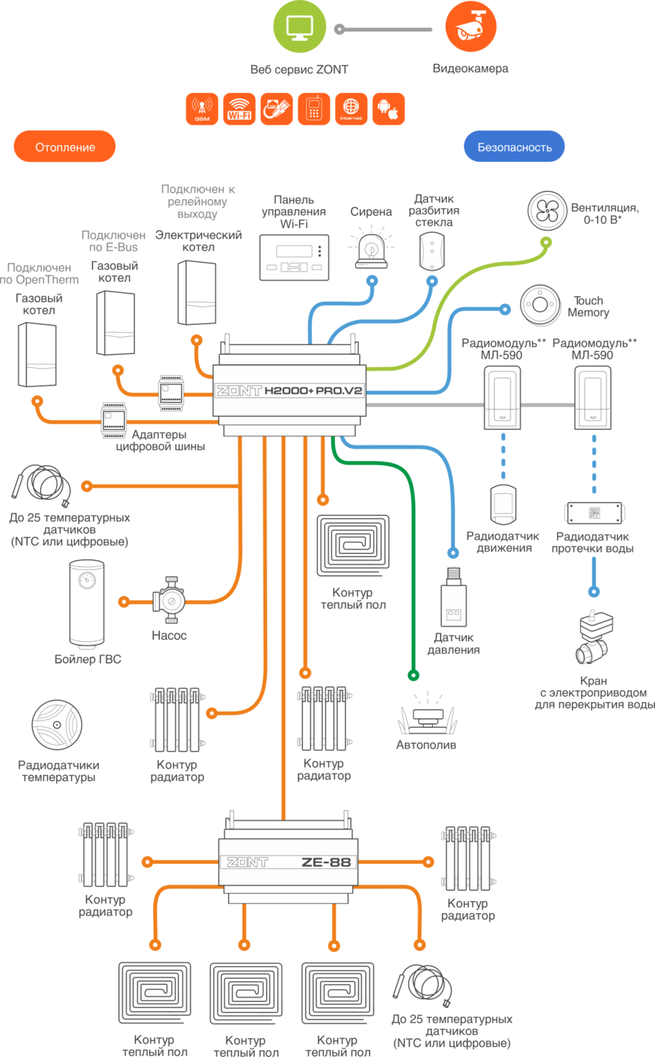 Контроллер автоматически управляет системой отопления и горячего водоснабжения любой конфигурации и сложности без ограничения числа управляемых контуров. На базе контроллера ZONT H2000+ PRO.V2 строятся как системы диспетчеризации котельной, так и полноценные системы безопасности, ситуационного управления инженерным и электрическим оборудованием.