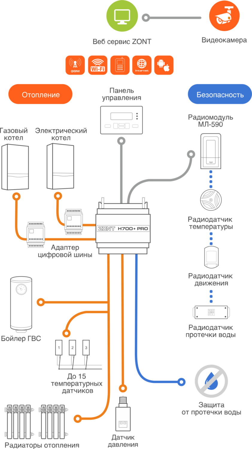 ZONT H700+ PRO.V2 управляется автоматически по запрограммированному алгоритму или вручную – через личный кабинет веб-сервиса, мобильное приложение. Контроль параметров системы отопления и состояния подключенного оборудования доступен из личного кабинета веб-сервиса и мобильного приложения.